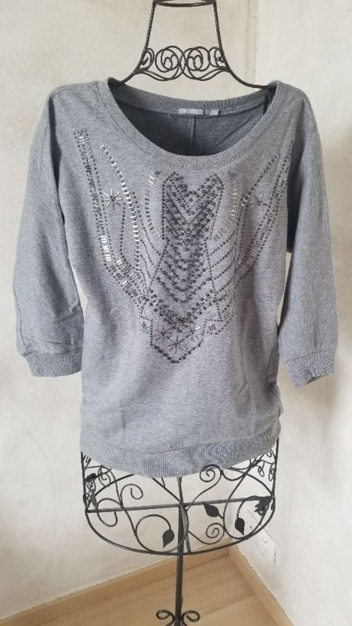 Sweat gris à motifs. Manches 3/4. Marqué 34/36 mais correspond à un 38
