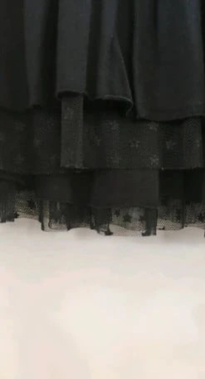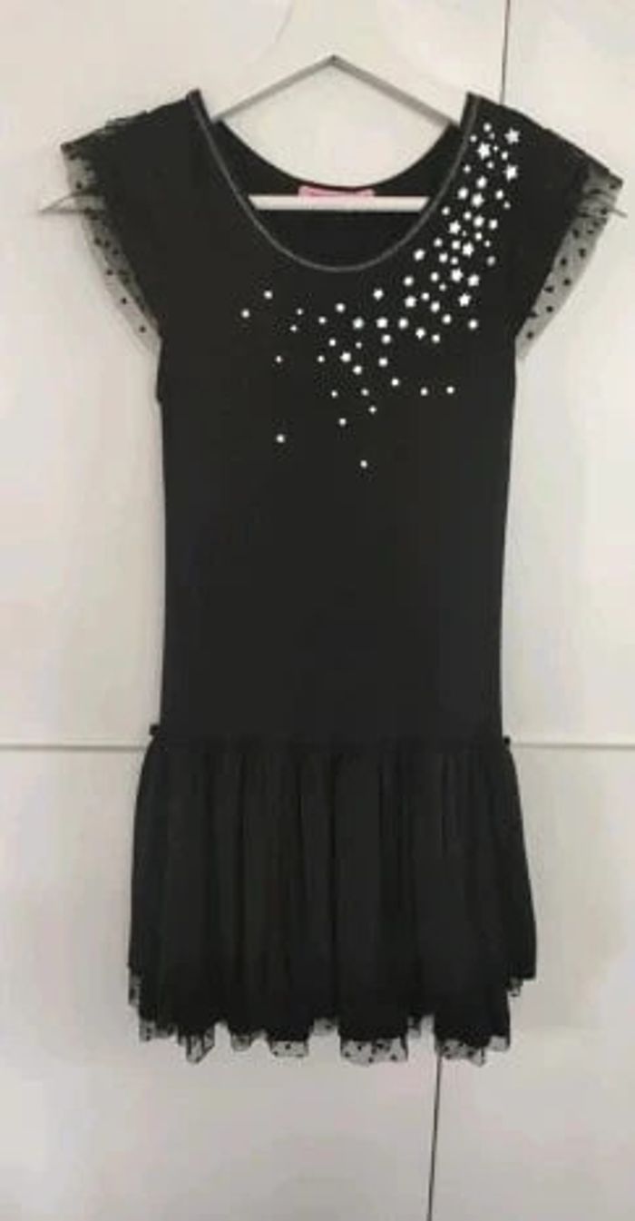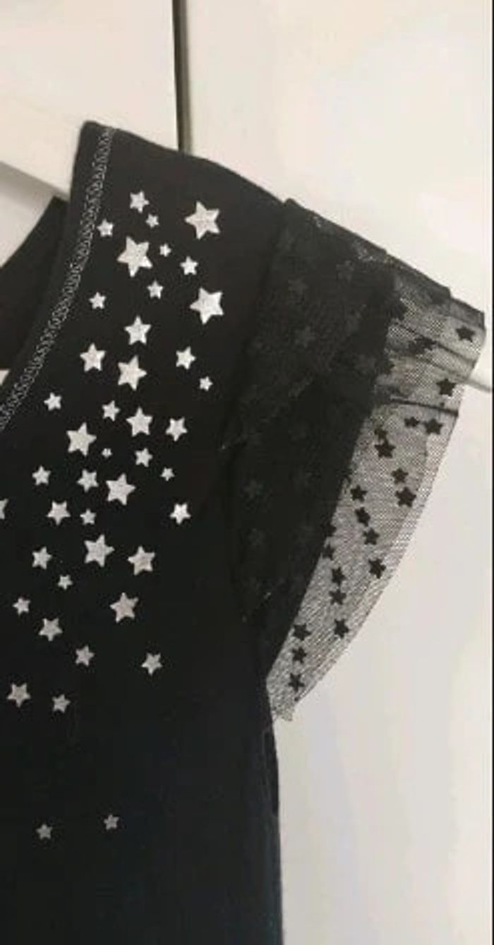 Robe noire avec étoiles argentées. Effet superposition à la base et aux manches. Bien extensible, très confortable, 10 ans. Très bon état, très peu mise, marque NKY #vulariFilles10ans