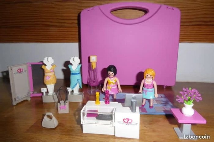 Valisette rose avec deux personnages et une multitude d'accessoires : sacs, tenues. S'emporte partout pour jouer ! Très bon état. Complet. Vendu avec la valisette et la notice. #vulariPlaymobil