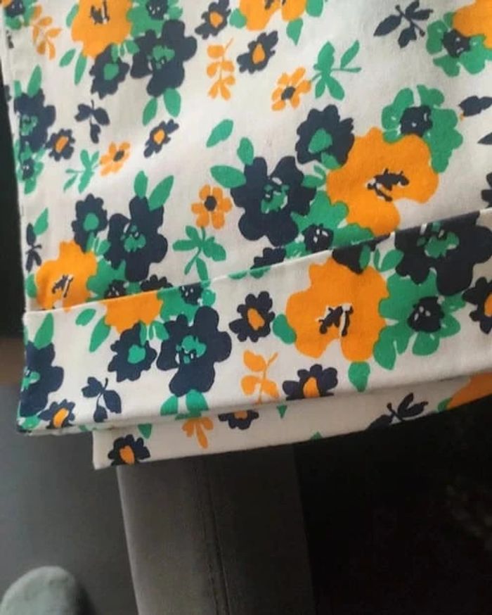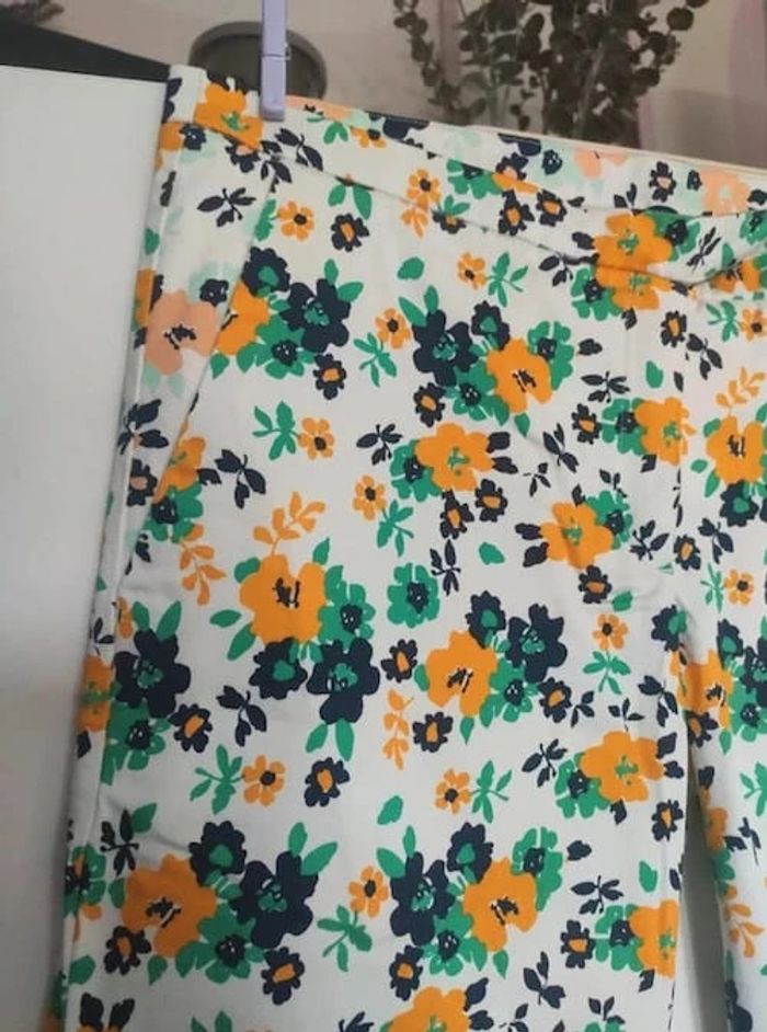 Joli pantalon fleuri blanc avec motif orange, vert et bleu marine. Neuf, jamais porté, juste lavé ! 2 poches cavalières, fermeture par fermeture éclair et crochet, deuxième crochet sur le côté, effet bas retroussé. Longueur entre l'entrejambe et le bas du pantalon 72 cm. Taille L, acheté dans une boutique Petit bateau #vulariFemmesL40 #vulariPetitBateau