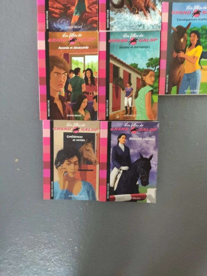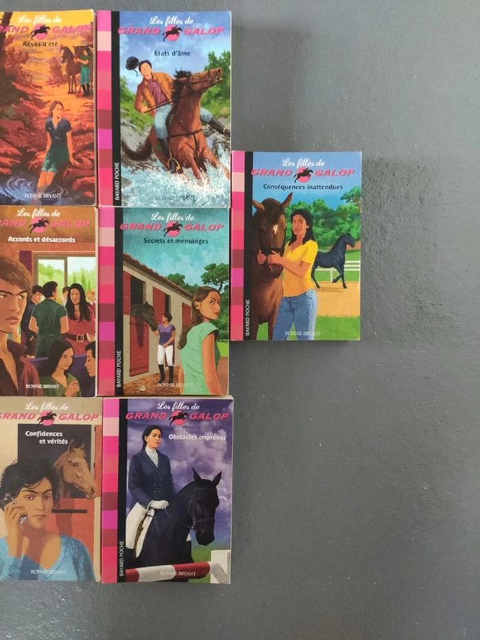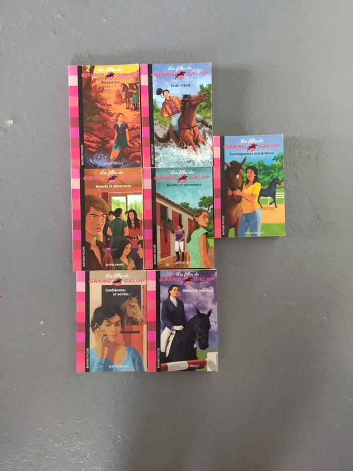 7 livres Bayard poche de la collection Les filles de grand galop. Ces livres font jusqu'à 180 pages ! Numéro 2 rêve d'été. Numéro 4 secrets et mensonges. Numéro 5 confidences et vérités. Numéro 6 accords et désaccords. Numéro 7 conséquences inattendues Numéro 8 obstacles imprévus Numéro 9 etats d'âme Les pages intérieures sont en très bon état. Par contre des couvertures sont abimées. Je pense que le numéro 8 est neuf, ET peut-être aussi le numéro 9. J'ai énormément de livres Grand galop. N'hésitez pas à regarder mes annonces ou a me demander