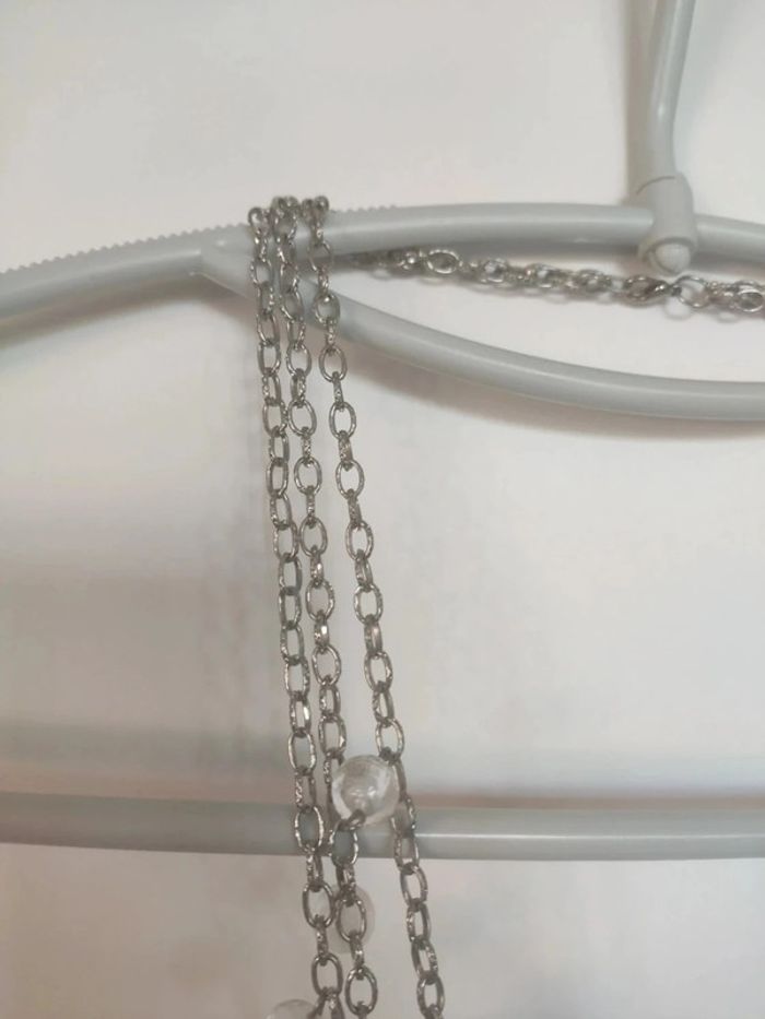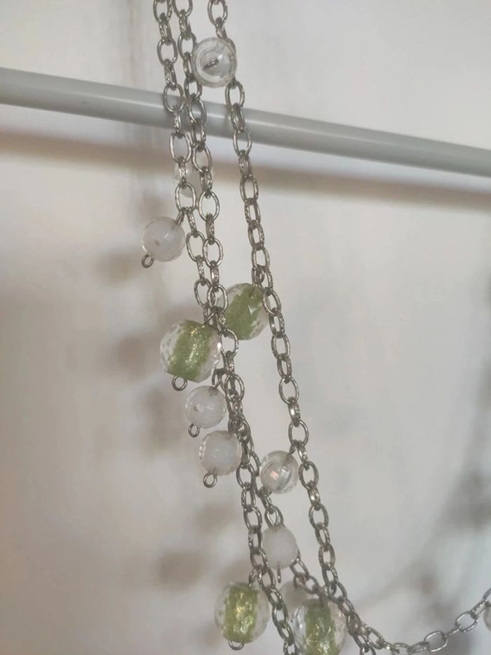 Collier à trois rangs argenté avec des breloques blanc et vert clair en plastique. Hauteur totale 34,5 cm. Très bon état. #vulariBijoux