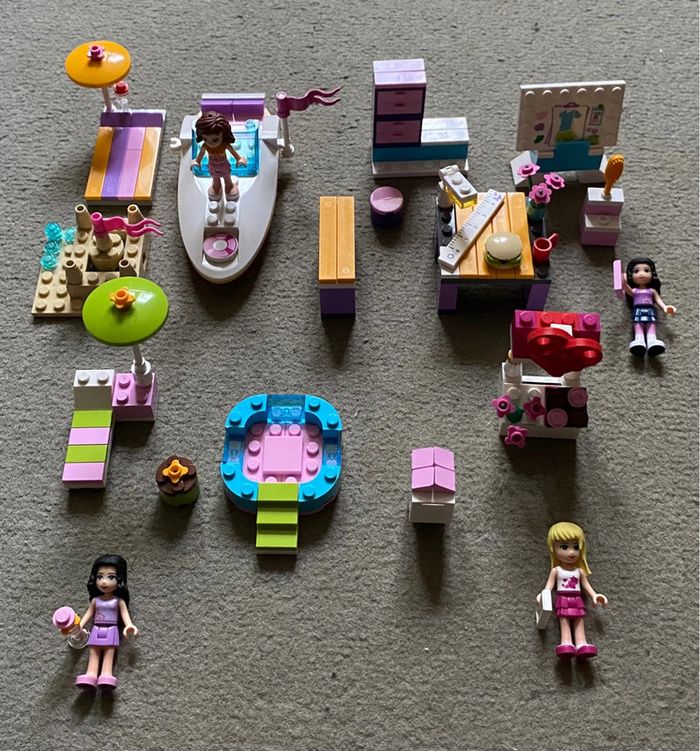 Je vends le lot de 24 Lego Friends 99€ ou : Lego 3061 : Complet, avec notice, il manque 4 pièces + 5 remplacées (10€) Lego 3063 : Complet, sans notice (9€) Lego 3183 : Complet, avec notice, il manque 3 pièces (5€) Lego 3931 : Complet, sans notice, il manque 1 pièce (4€) Lego 3936 : Complet, sans notice, il manque 2 pièces (5€) Lego 3937 : Complet, sans notice, il manque 2 pièces (5€) Lego 30105 : Complet, sans notice (3,50€) Lego 41400 : Complet, sans notice, sans perso (4€) Lego 41003 : Complet, avec notice, il manque 2 pièces (5€) Lego 41013 : Complet, avec notice, il manque 2 pièces, 4 pièces remplacées (5€) Lego 41019 : Complet, avec notice, il manque 1 pièces(3€) Lego 41042 : Complet, avec notice (3,50€) Lego 41104 : Complet, sans notice, il manque une dizaine de pièces (5€) Lego 41007 : Complet, sans notice, sans perso , il manque 5 pièces (9€) Lego 41035 : Complet, avec notice, il manque 4 pièces (10€) Lego 41098 : Complet, sans notice (5€) Lego 41306 : Complet, avec notice, il manque 3 pièces (4€) Lego 41333 : Complet, avec notice, il manque 1 pièce (8€) Lego 41342 : Complet, avec notice, il manque 3 pièces (5€) Lego 41346 : Complet, avec notice, seulement l’appareil photo, il manque 2 pièces + 1 remplacer (5€) Lego 41442 : Complet, sans notice, il manque 4 pièces (4€) - Lego 41677 : NEUF (7€) Lego 41,695 : Complet, avec boîte et notice (10€) Lego 561603 : Complet, sans notice (2€)