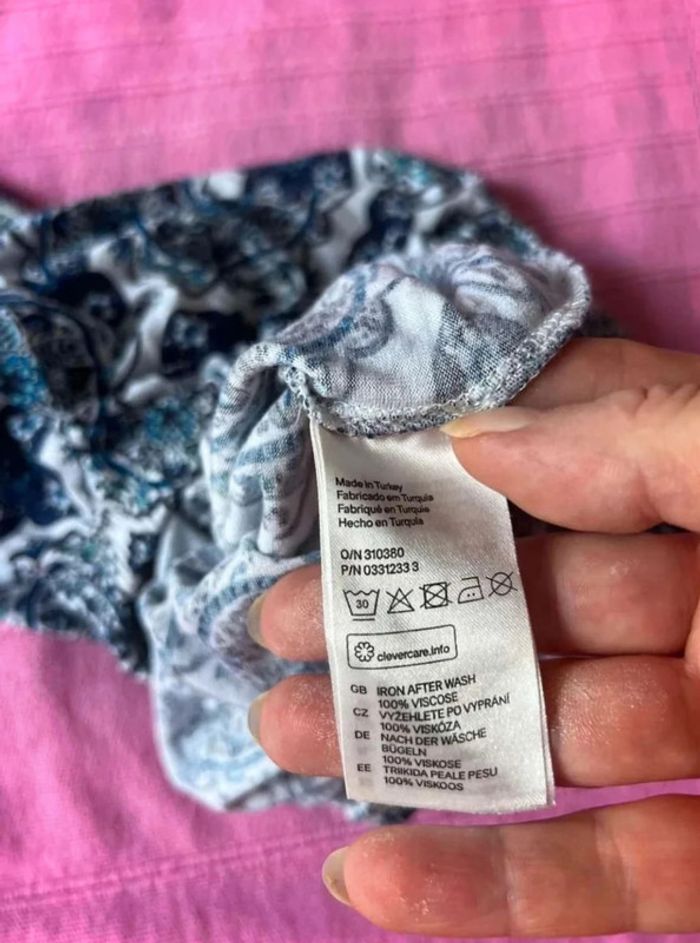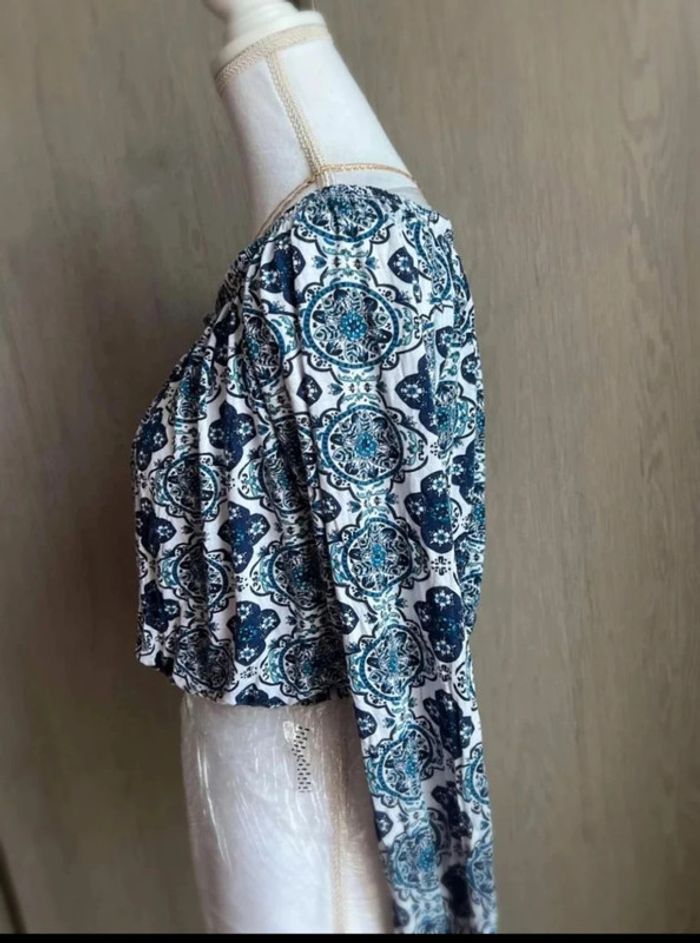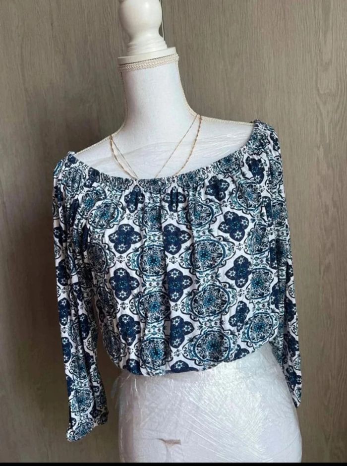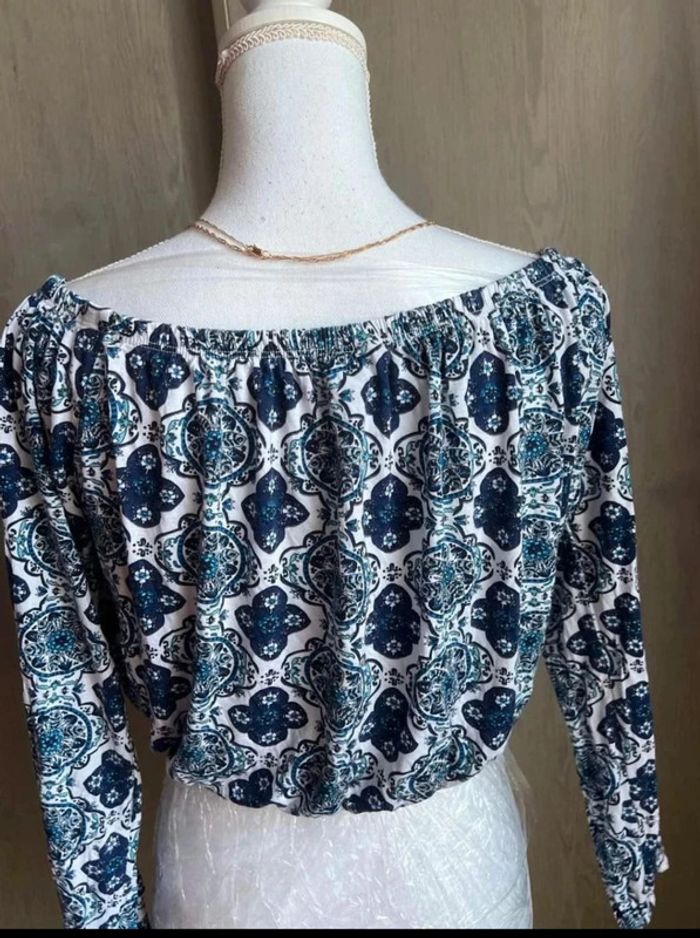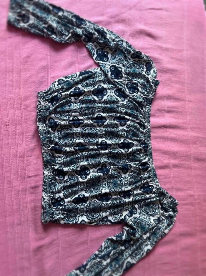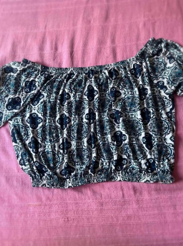 Jolie top, court, imprimé avec épaules dénudées , une fois porté.