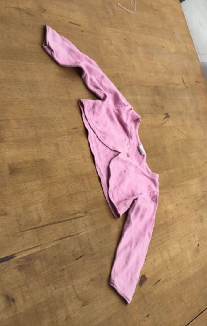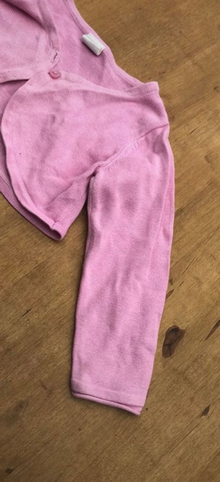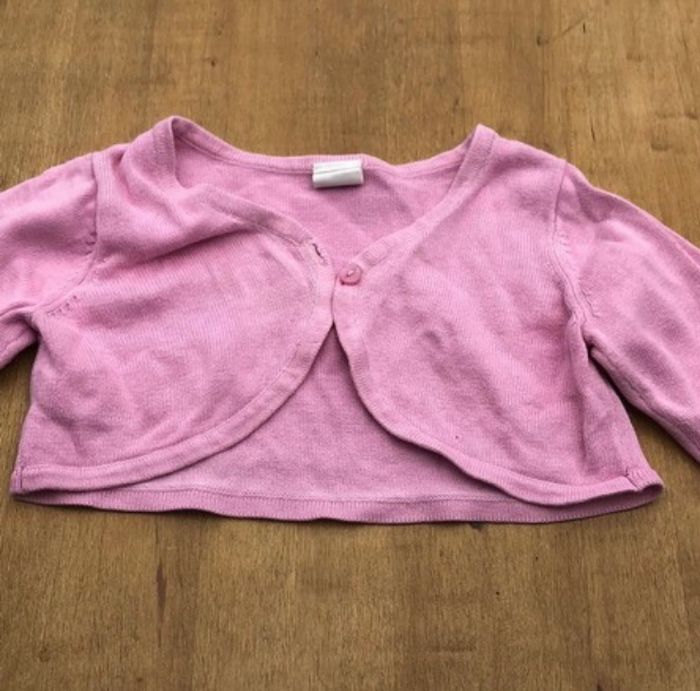 Gilet court rose pâle se ferme avec un petit bouton rose. Taille 9/12 mois