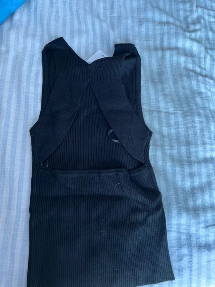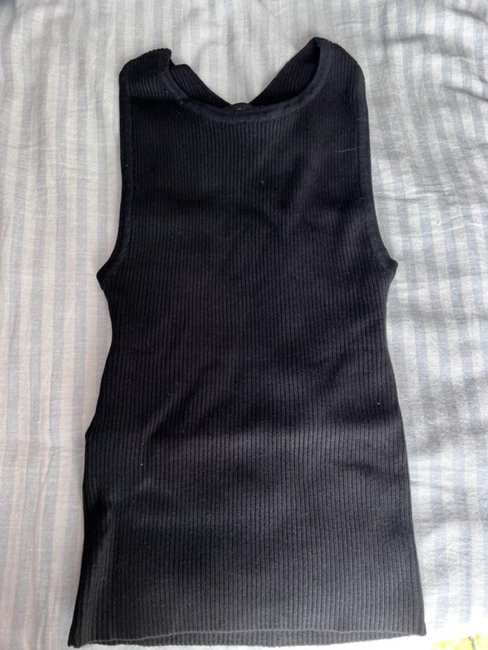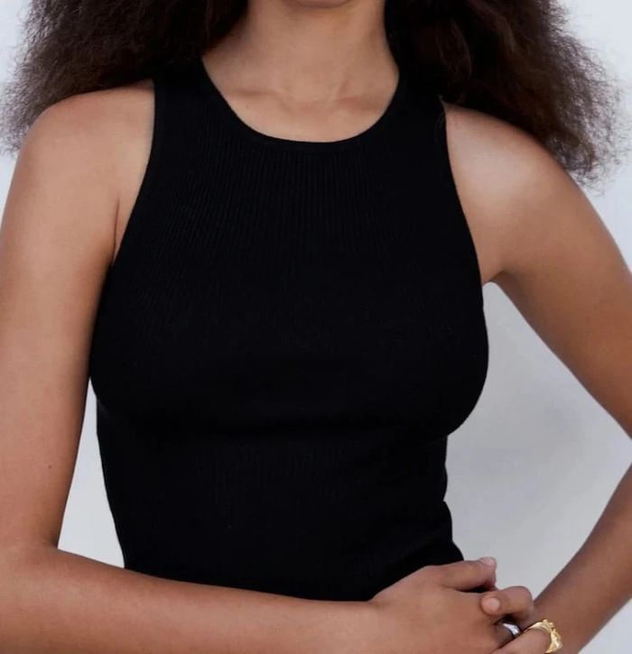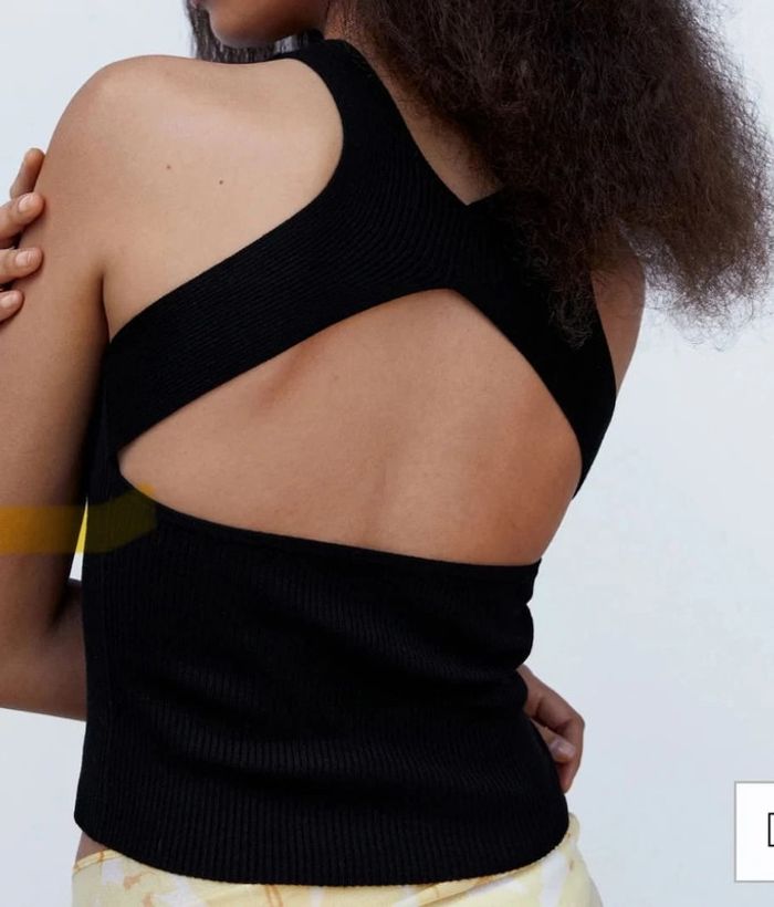 Débardeur en maille fine, larges bretelles, ouverture au dos. Style crop.