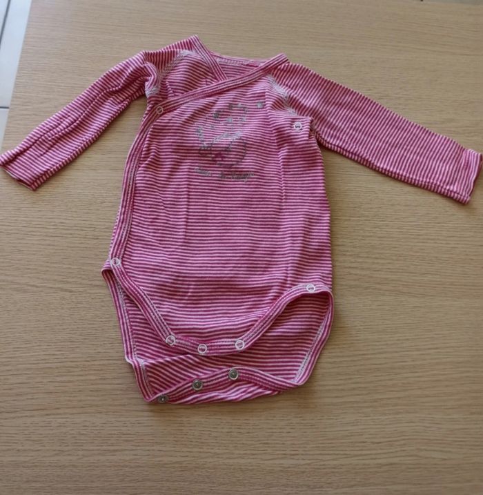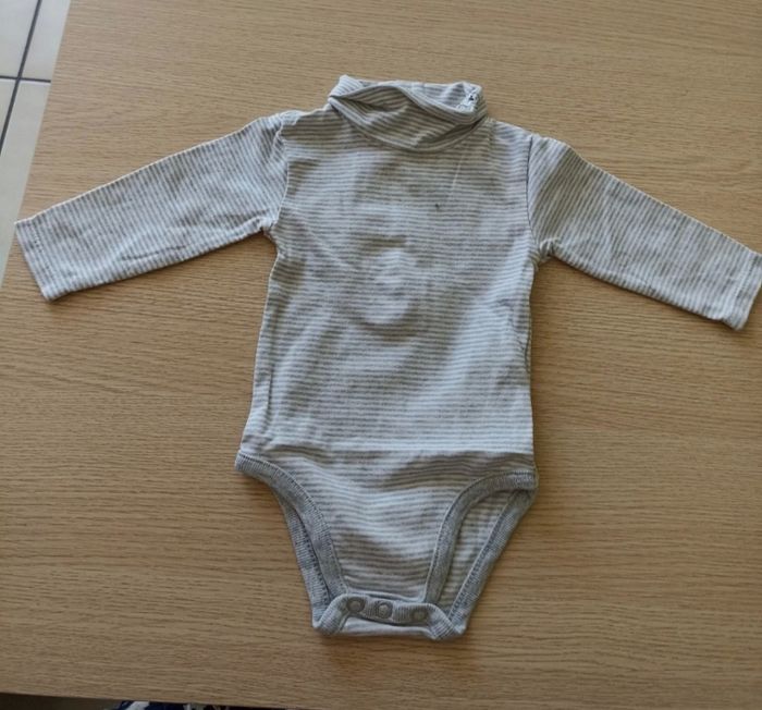 Lot de 4 bodies rayé Taille 3 mois Un rose Un blanc et bleu Un gris et blanc a col roulé Un gris et blanc Bon état