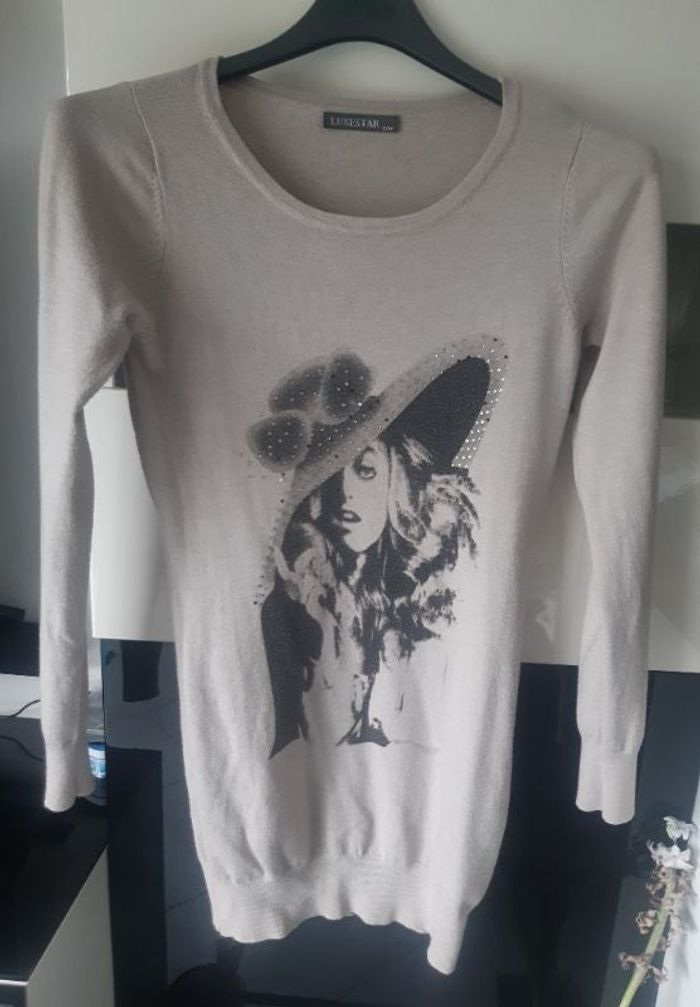 #NINIE0843_T36 Robe pull beige avec grand motif femme et strass pour la décorations chapeau( il en manque quelques uns). Taille S/M.