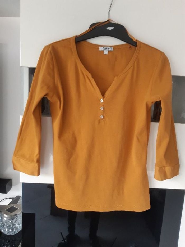 #NINIE0843_T36 Tee-shirt manches 3/4 col tunisien. Taille 1. Coloris jaune moutarde. Très bon état, porté 2 fois. Largeur épaules environ 36.5cm Longueur environ 54.5cm