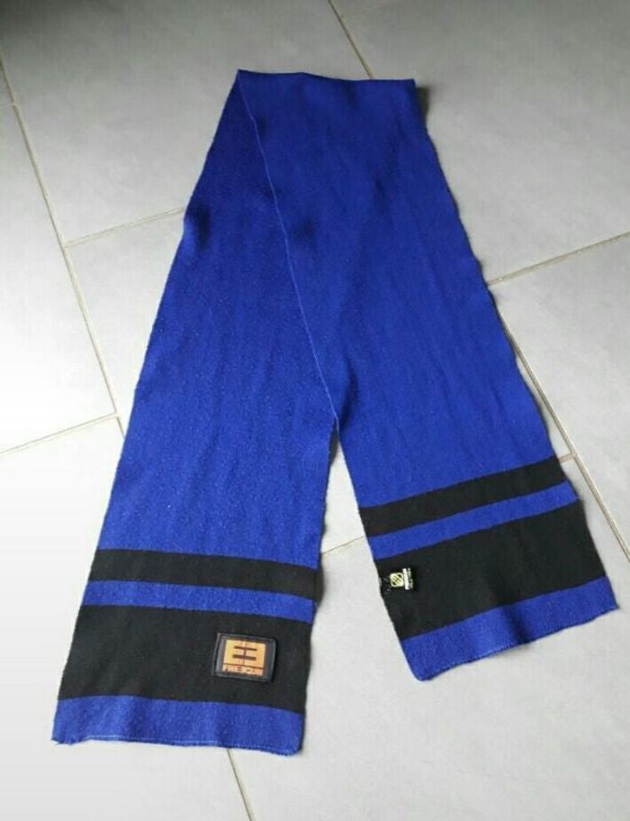 NINIE0843_8ans Écharpe garçon freegun. Coloris bleu vif et noir aux extrémités. Motif freegun orange et noir. En très bon état, il y a juste un petit coin de décousu ( voir photo)