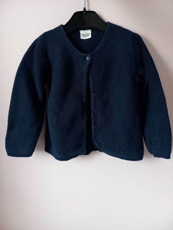 Gilet 3 ans couleur bleu marine. Fermeture par boutons. Motif fantaisie dans le bas du gilet.
