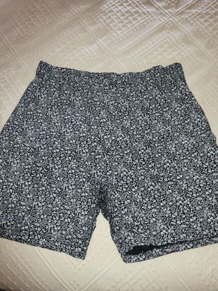 Short fleuri noir blanc tout viscose t 44 .long 47 cm .larg taille 44 cm .bassin 58 cm .un peu delave entre jambe mais se voit pas porte