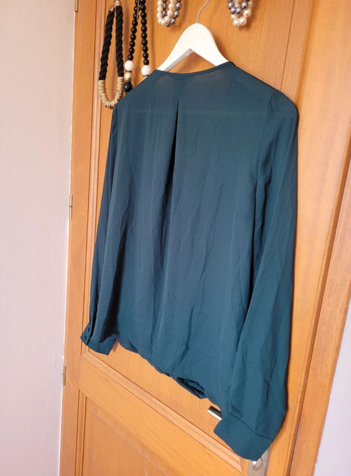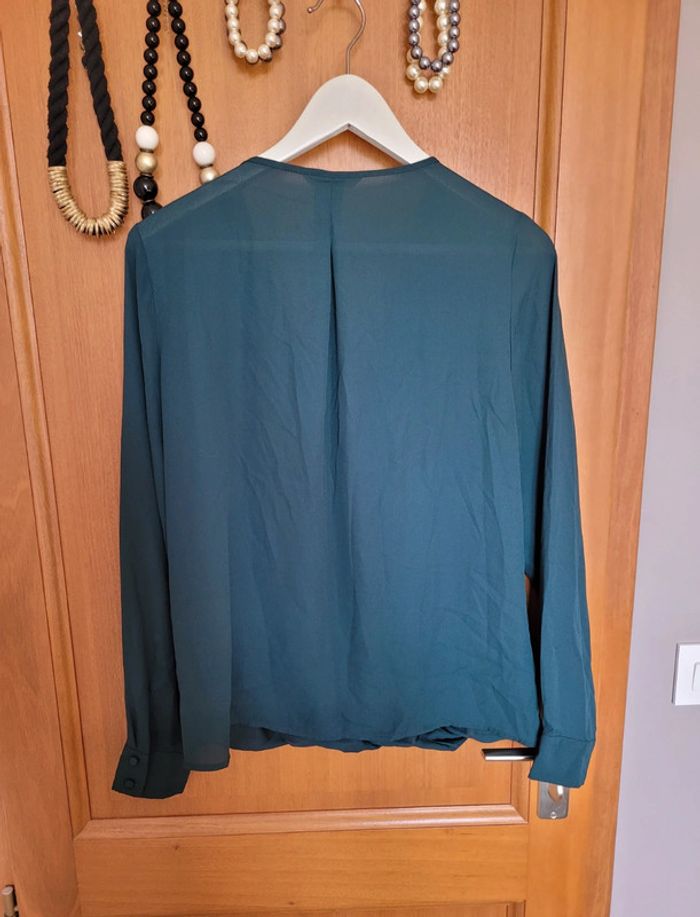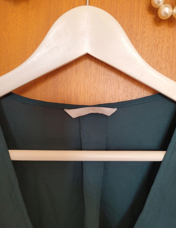 Blouse pour femme de la marque H&M et de taille 38 Col V avec effet cache cœur Doublure intérieure et bouton pour éviter la transparence au niveau du décolleté Couleur vert sapin L'étiquette a été coupée mais correspond à une taille 38 Aucune tâche ni trou #mabi38780femme38 #mabi38780femmeM