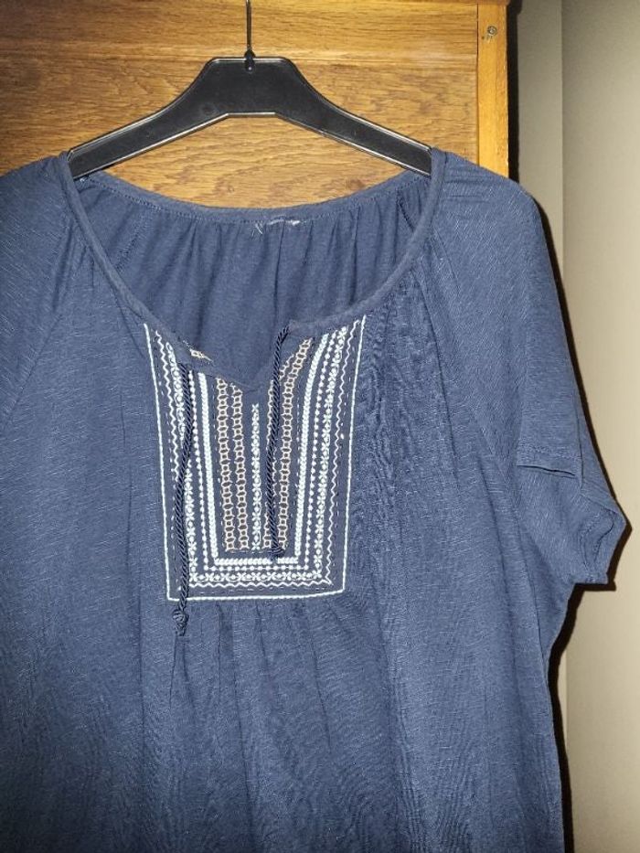 tunique marine avec broderies bleu ciel et blanc, perles argentees, sur le devant, longueur 70 cm, larg poitrine 54 cm, très bon état, tout coton et frais pour l'été , décolleté , marine comme photo 1 a 3