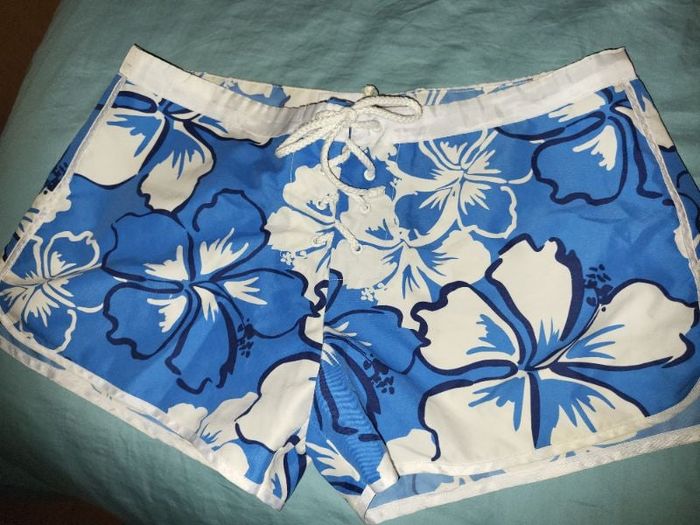 short blanc et bleu t 42 , cordon à nouer , long 29 cm, larg bassin 53 cm, en polyester , très bon état