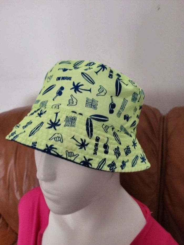 bob réversible, bleu et d'un coté vert anis "hey guy" on wave, t 54 , taille 10 a 12 ans