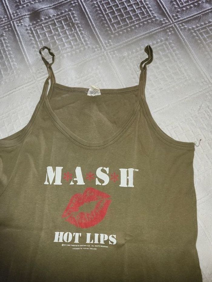 ensemble nuisette et peignoir kaki imprimé MASH HOT LIPS, made in england, long 80 cm, et larg poitrine 52 cm en tirant un peu pour les 2 coordonnés, bon état , coton épais,( sauf une tache de délavé sur peignoir (photo 9) ) peignoir manches courtes avec un cordon à passer dans passants taille, se porte croisé, couleur réelle du kaki comme photo 1 pour l'ensemble