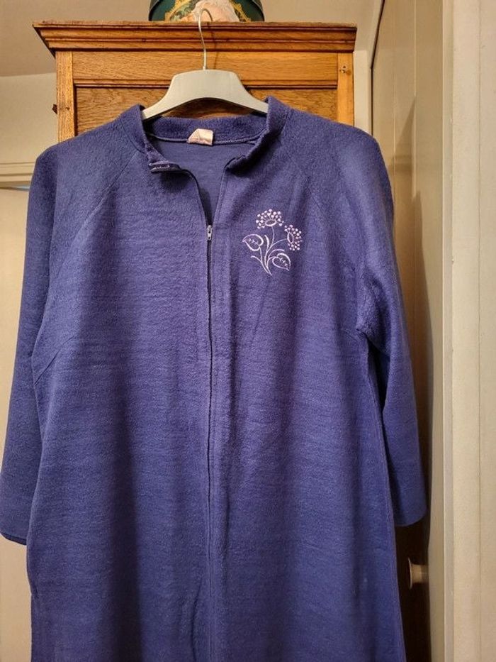 robe de chambre chaude en 100% acrylique t 44 , long 115 cm, larg sous bras ou poitrine 57 cm, fermée par glissière devant, 1 poche, parme foncée pour la couleur , couleur comme photo 2