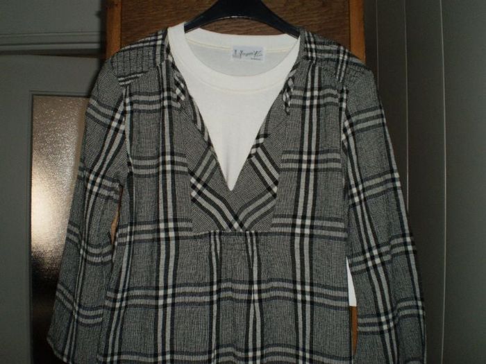 tunique blanc , gris et noir , t 40 NEUF AVEC ETIQUETTE motif carreaux "princes de galles" long 64 cm, larg poitrine 49 cm (pour tour de poitrine de 98 cm maximun), se porte seul ou sur un pull en hiver, manches 3/4 , mélange de coton mixte, IMPULSE LA MARQUE, couleur réelle comme photo 2, 14,50 euro dernier prix , c neuf avec etiquette, peut se porter comme photo 1 avec un maillot manches longues coton par exemple ou sous pull aussi