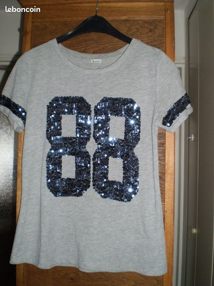 Tee shirt gris clair paillettes marine t 38 PIMKIE , long 57 cm, largeur poitrine 46,50 cm, tout coton, très bon état