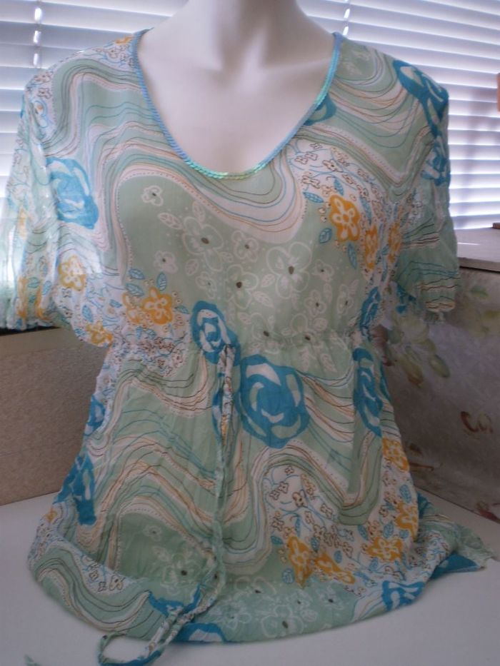chemisier voile t 40 ou t 42 , neuf non porté, longueur 64 cm , largeur poitrine 54 cm, avec un élastique à la taille a nouer, pailleté fluorescent turquoise sur le bord du décolleté V, frais pour l'été tout viscose
