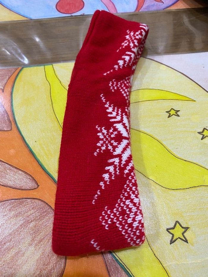Bandeau cache oreille rouge avec des dessins blancs