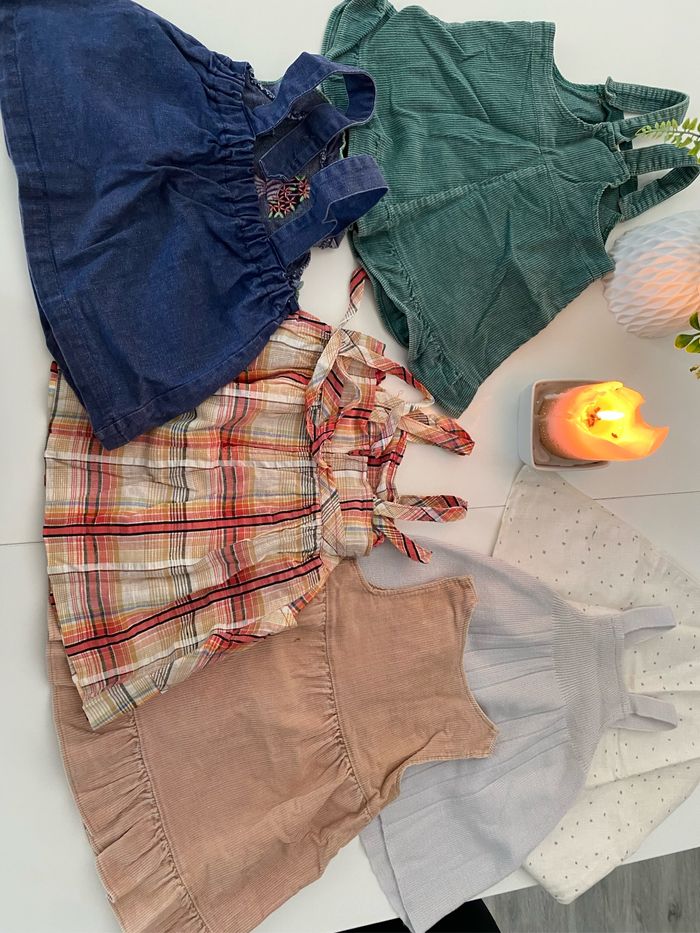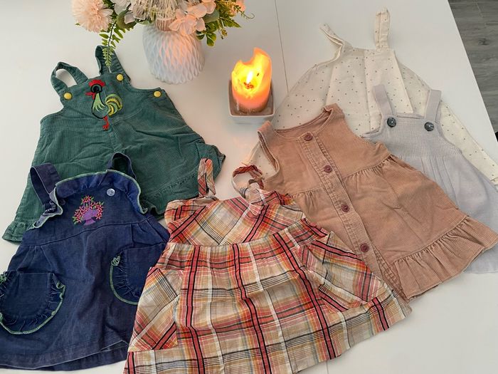 Lot de 6 robes vintage en 1 an . Bon état général ( un tache sur l’une des robes qui devrait partir au lavage , voir photo )