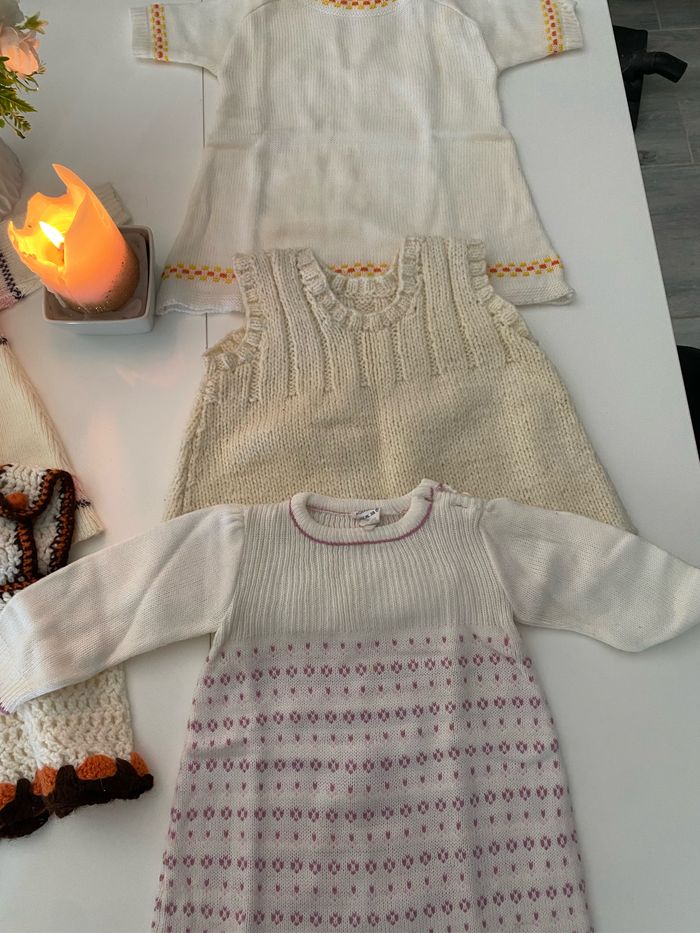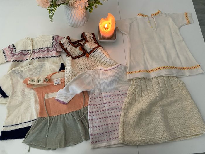 Lot de 6 robes vintage en 3 mois . Bon état général ( qq taches qui devraient partir au lavage , voir photos ) et je donne la robe rose avec