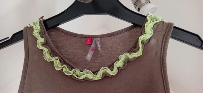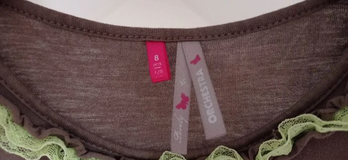 🔮 Débardeur pour Fille en 8 ans 🔮 De chez ORCHESTRA Motif de libellule avec le col frou frou en vert anis De couleur marron avec la libellule en bleu et vert. Les ailes sont rose en forme de pétales qui sont cousues au debardeur, vraiement tres joli rendu 👍 En excellent état Tous mes vêtements Fille en 8 ans : #delphinedsxfille8ans