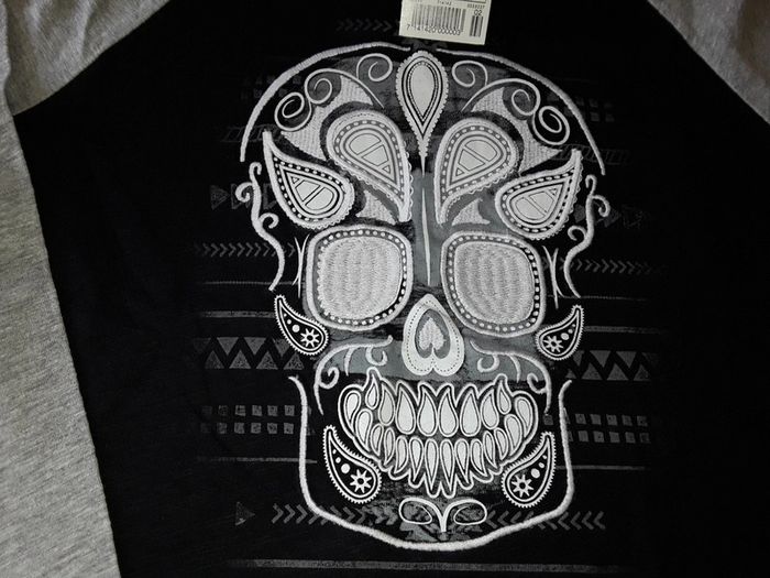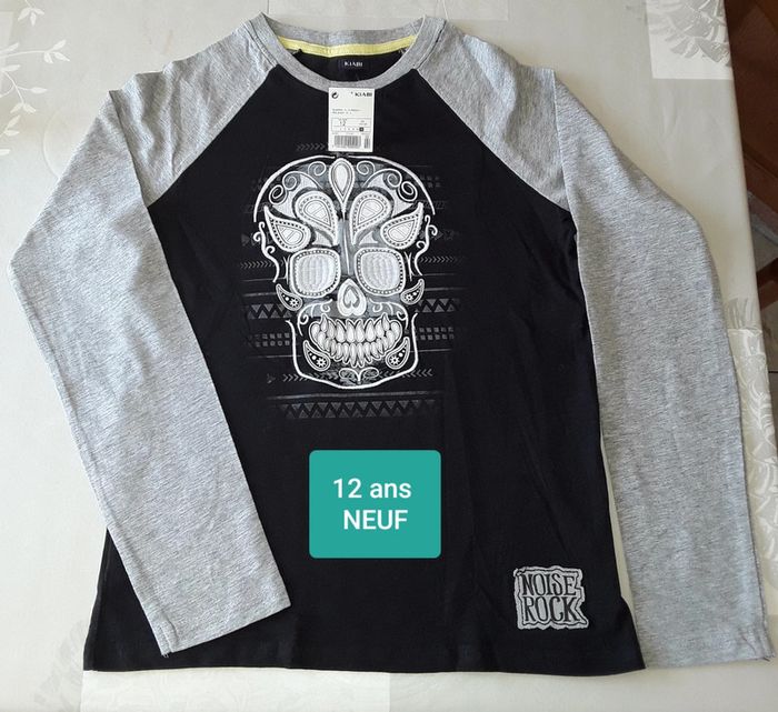 🔮 Tee Shirt pour Garçon / Ado en 12 ans 🔮 NEUF , avec étiquette À longues manches De couleur noir avec manches grises Et motif Tête de Mort sur le devant Tous mes vêtements Garçon en 12 ans : #delphinedsxgarcon12ans