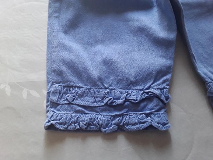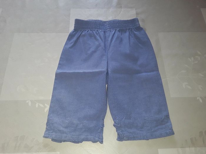 🔮 Pantalon pour Fille en 2 ans / 24 mois 🔮 Taille élastiquée Avec 2 rangées de petits volants dans le bas des jambes à l'arrière De couleur bleu clair En très bon état Tous mes vêtements Fille en 2 ans : #delphinedsxfille2ans