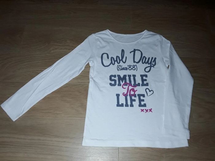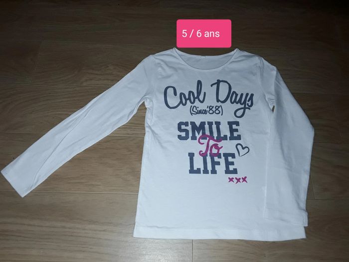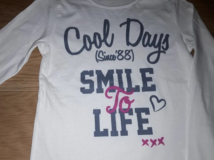 🌺 Tee Shirt pour fille en 5 ans 🌺 Il est NEUF, sans étiquette Tee Shirt à longues manches De couleur blanc , avec inscription en bleu et un peu de fushia Inscription : Cool Days Smile To Life 😊 Tous mes vêtements Fille en 5 ans : #delphinedsxfille5ans