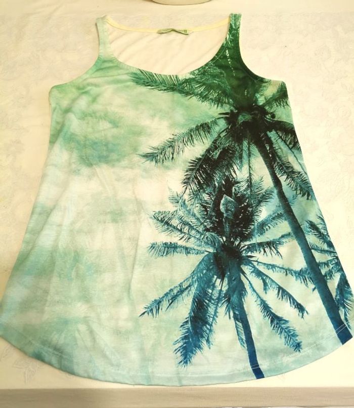 Débardeur pour femme ou jeune fille, taille S. Jolies couleurs, motif palmiers avec paillettes.