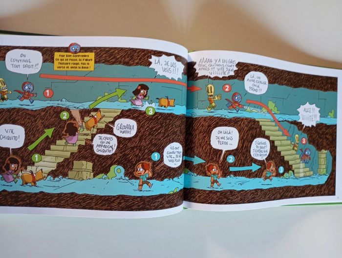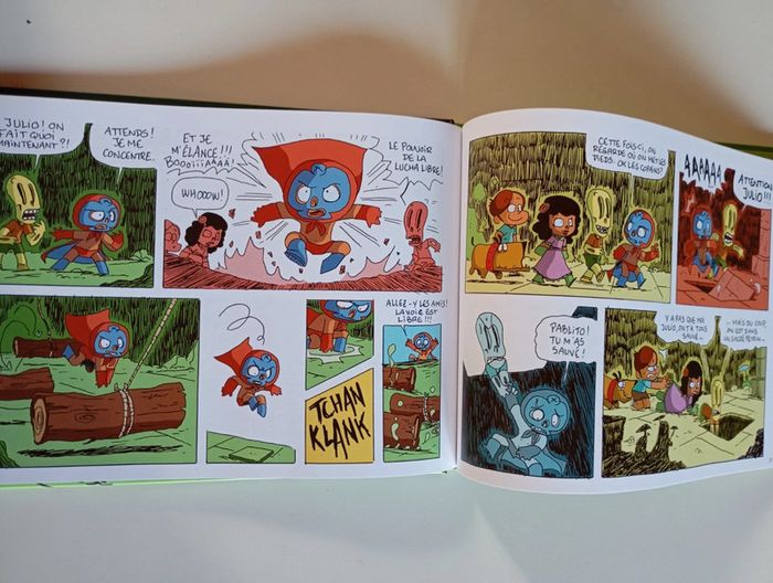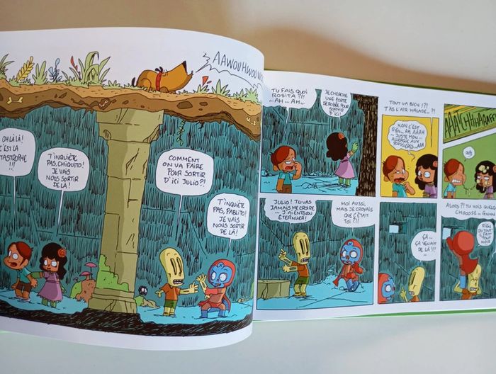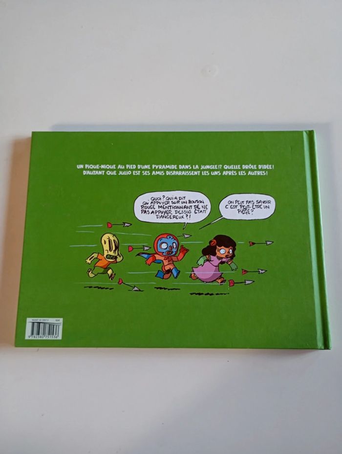 En week-end camping, Julio, Pablito, Rosita et Chiquito ont envie de se faire peur avec des histoires autour du feu de camp. Alors que Chiquito part en quête d'un coin pipi de fortune, il tombe dans une trappe secrète. Ses amis partent à sa recherche, et y tombent aussi. Que vont-ils bien pouvoir faire? Ils comptent bien sur Fernando, le chien, et son flair légendaire, pour les sortir de ce qui se révèle être un vrai labyrinthe, rempli de pièges. Et qui semble être habité par quelque chose qui pousse des grognements étranges… un monstre? Nos héros sauront-ils faire preuve de courage? Que le pouvoir de la lucha libre soit avec eux! Éditeur ‏ : ‎ Kennes les 3 As 40 pages Âge de lecture ‏ : ‎ Dès 8 ans Dimensions ‏ : ‎ 27 x 1 x 19.8 cm Livre en très bon état #camping #pyramide #labyrinthe