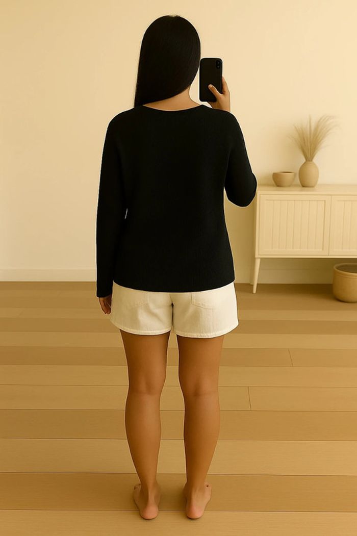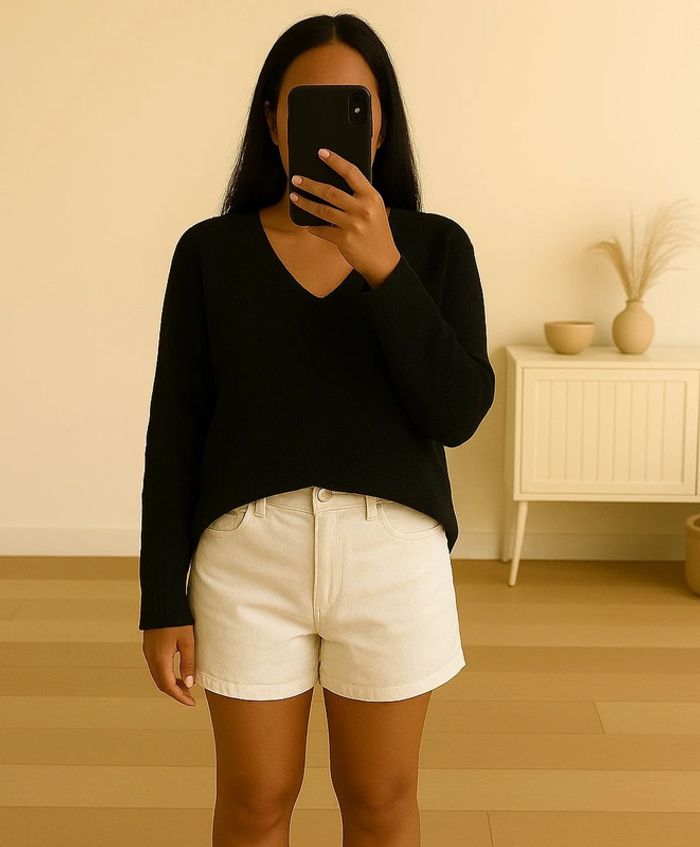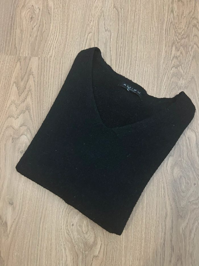 Pull col V Matière douce et chaude, contient probablement de la laine Couleur bien noire Très bon état Idéal pour les soirées d’été Taille M