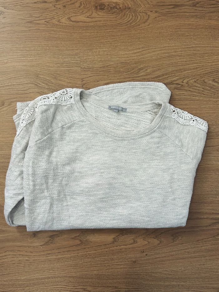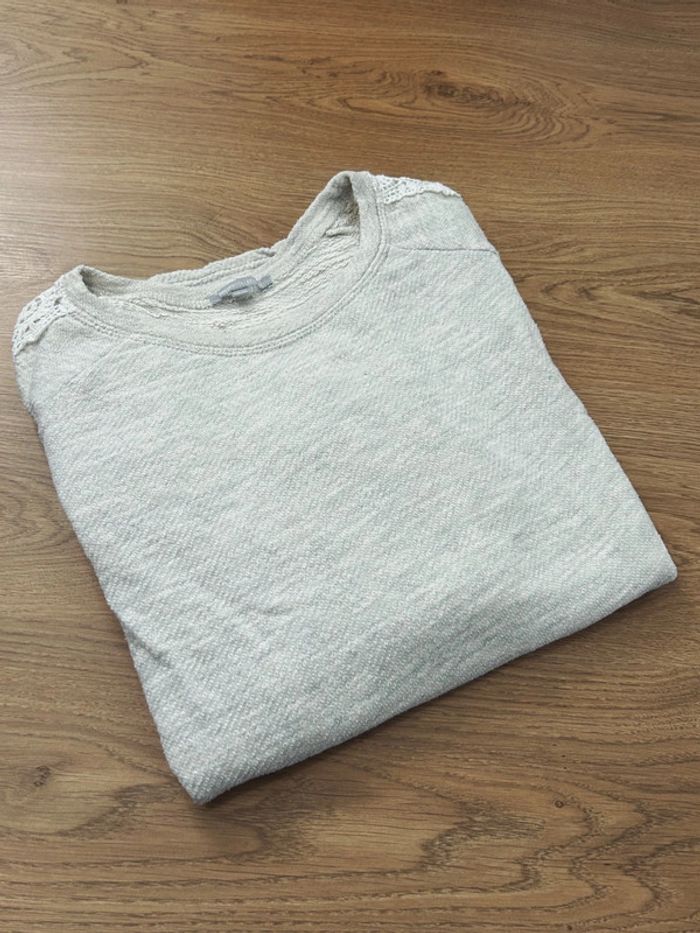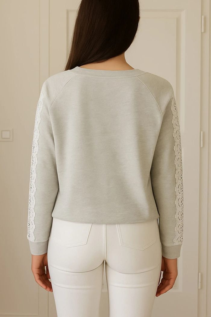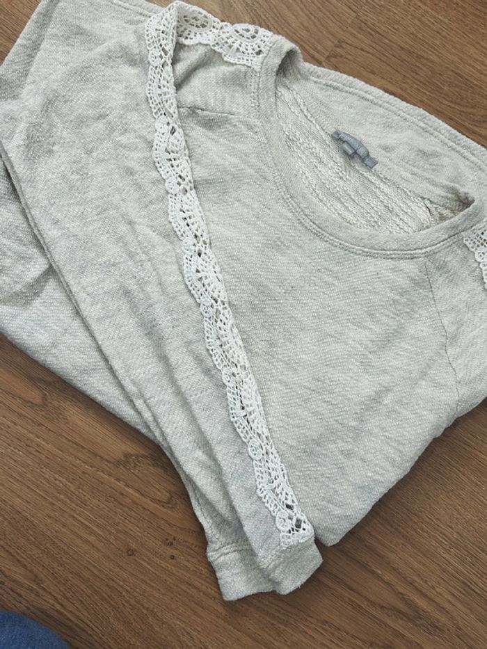 Jolie pull couleur gris chiné avec broderies sur les manches Col rond Taille 34/36 Très bon état 3suisses