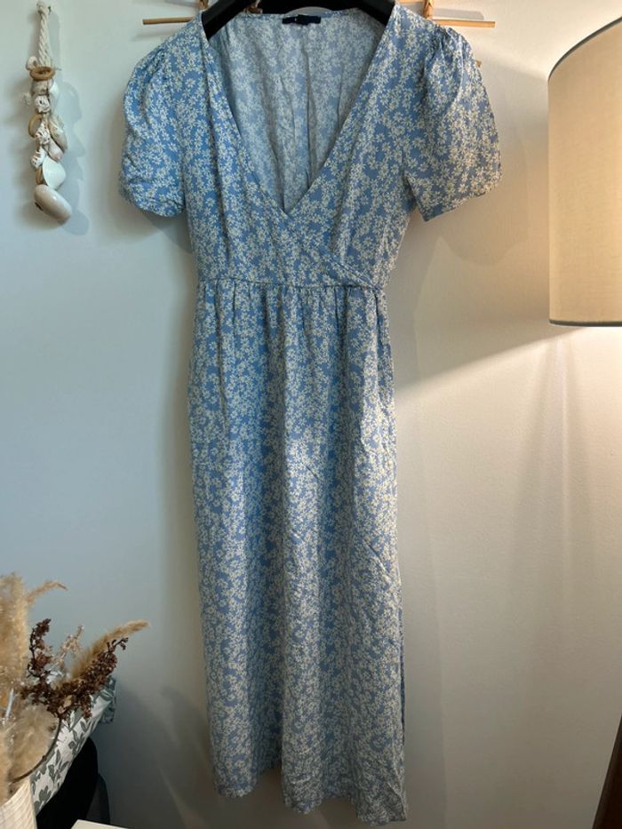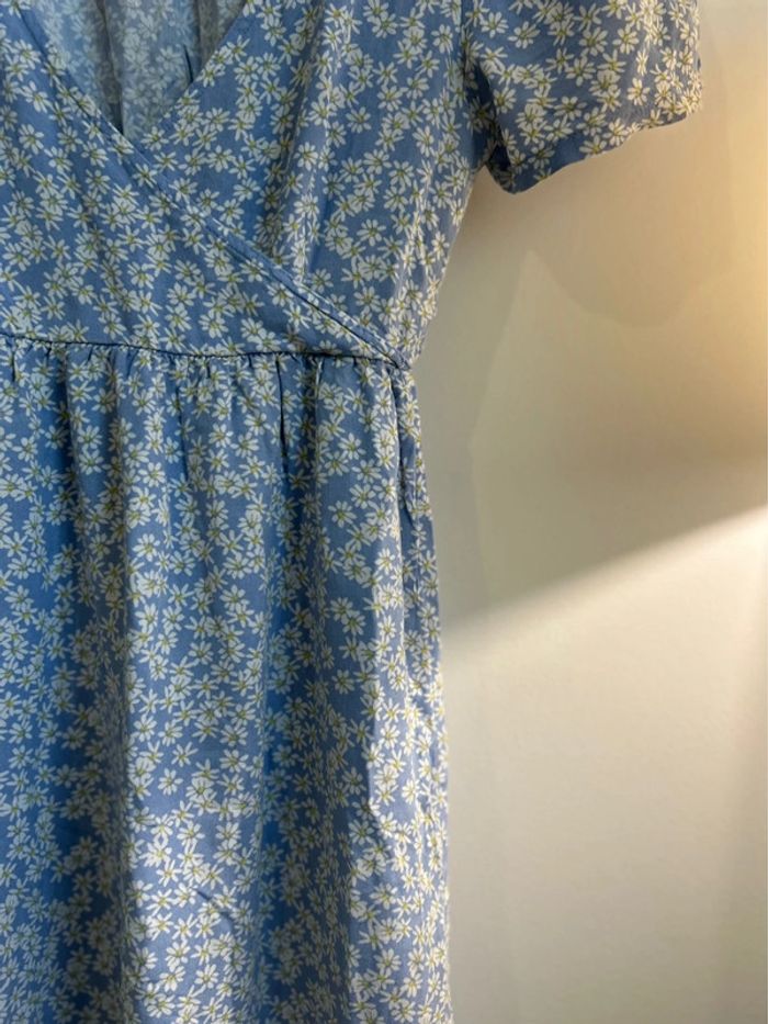 Robe longue drapée Motifs pâquerettes, marguerites Couleur bleu ciel et blanche Fendue sur le côté Taille XXS Neuve, étiquette coupée après l’achat