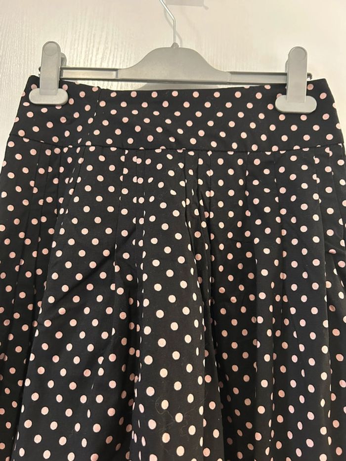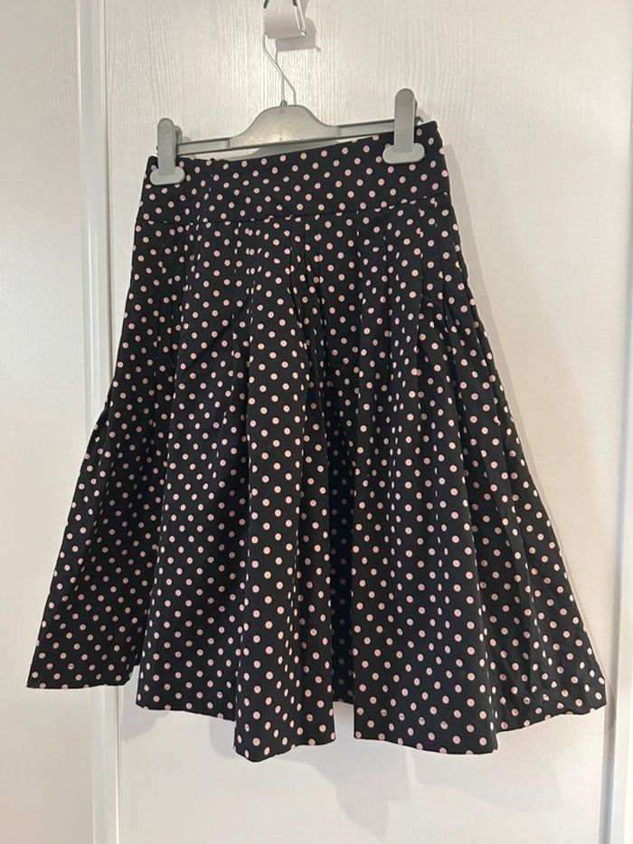 Jupe midi noire à pois roses Mango Coupe cloche, trapèze Tissu épais de très bonne qualité Fermeture éclair à l’arrière Vintage Taille 36 Très bon état