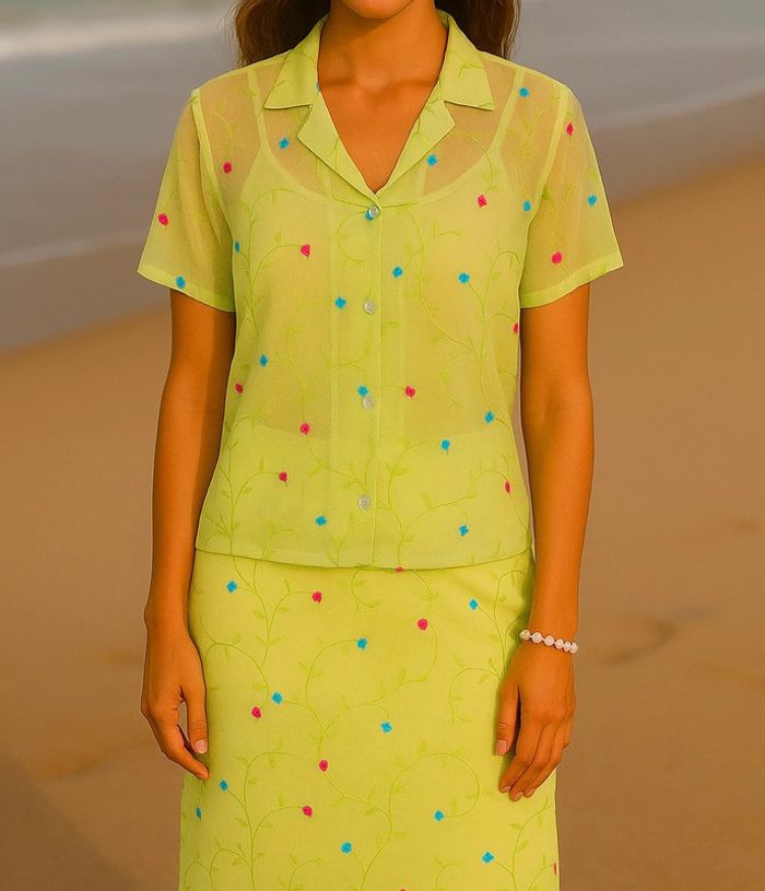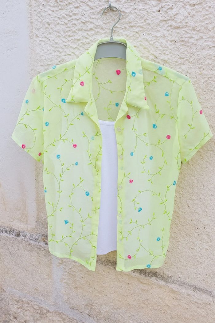 Joli chemise à manches courtes à imprimé fleurs, boutonné Peut se porter ouvert comme fermé Matière fluide mousseline Je vends également la jupe assortie de la photo dans mon dressing Taille 38/40 Très bon état Couleur vert d’eau et non jaune (vraie couleur sur la dernière photo) Pièce vintage