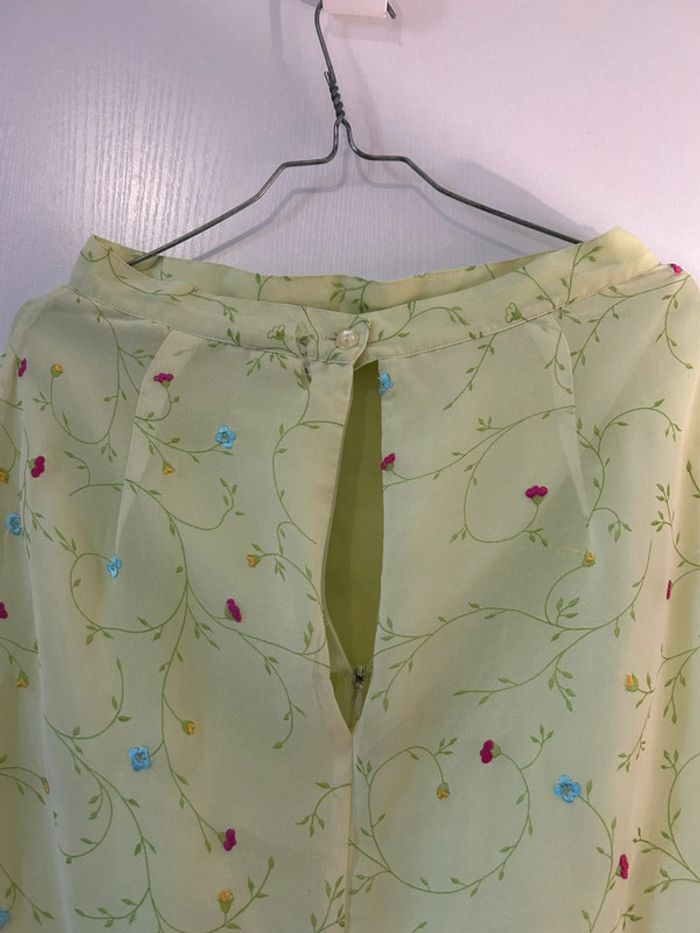 Jupe longue droite en matière mousseline Motifs fleuris, broderies anglaises Couleur vert clair vert d’eau Pièce vintage Un défaut : fermeture éclair arrière à réparer Taille 40 Je vends la même en bleu turquoise