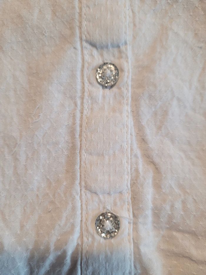 Chemise blanche à manches longues, boutons à paillettes argentées, petites inscriptions sur le col, en excellent état