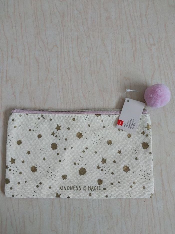 Jolie trousse Hema en toile écrue avec des étoiles dorées . Doublure rose. Idéal pour mettre du maquillage. Largeur : 22 cm ; hauteur : 13 cm . Pour mettre dans le sac a main.