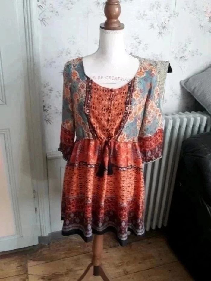 tunique neuve avec étiquette. Taille 36 . Vendue avec un débardeur long rouge . En 100 % polyester. La taille se resserre par un lien .