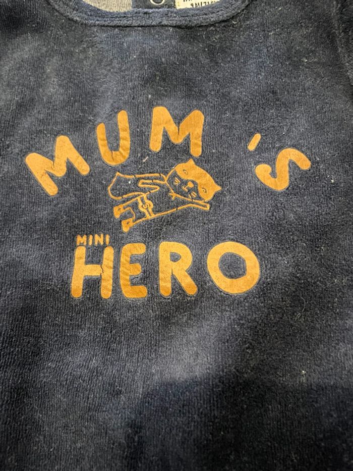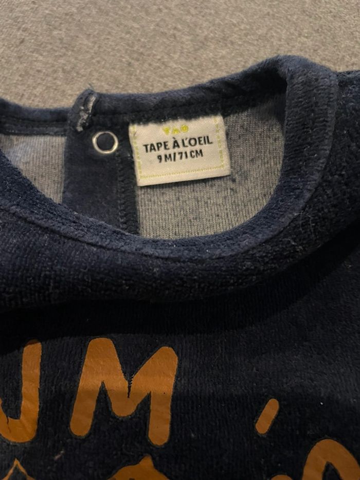 Vend pyjama tape à l’œil en velours taille 9 mois tres bon etat général juste écriture légèrement craquelé voir photo