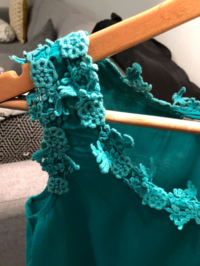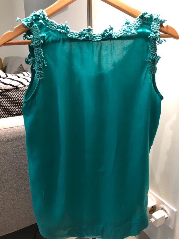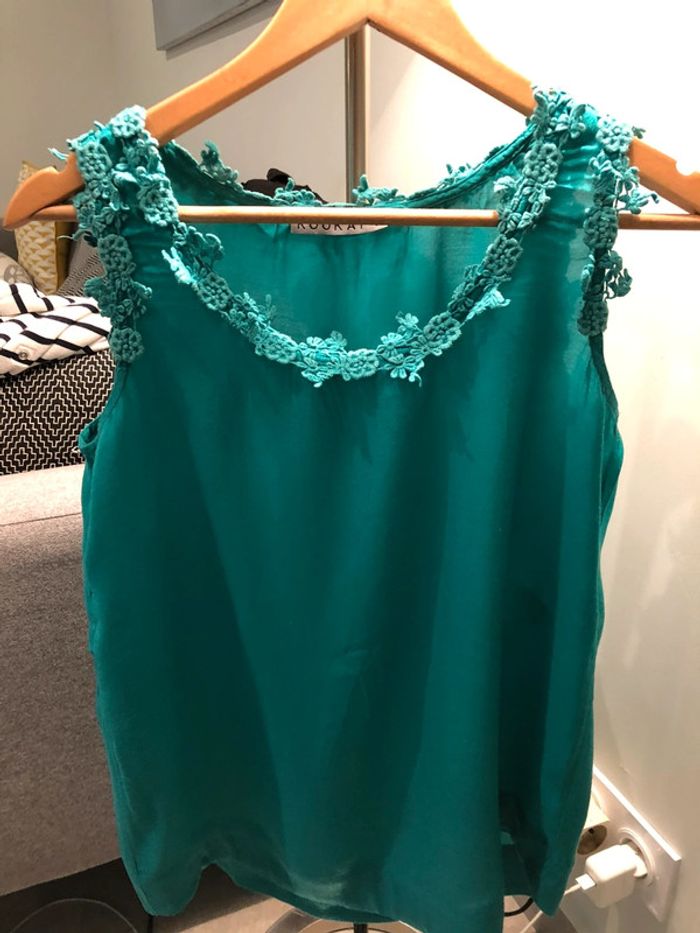Vend débardeur kookai taille 34 couleur vert d’eau bon état général juste quelques petites bouloches sur le côté voir photo