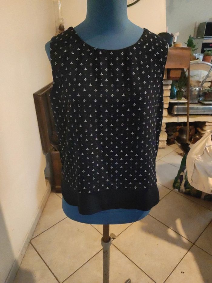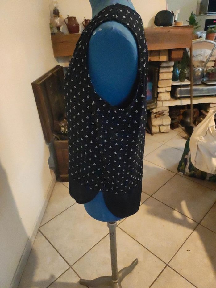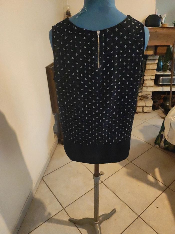 Débardeur bleu motif ancre marine blanche. Devant plus court que le dos. Fermeture dans le dos. Taille petit