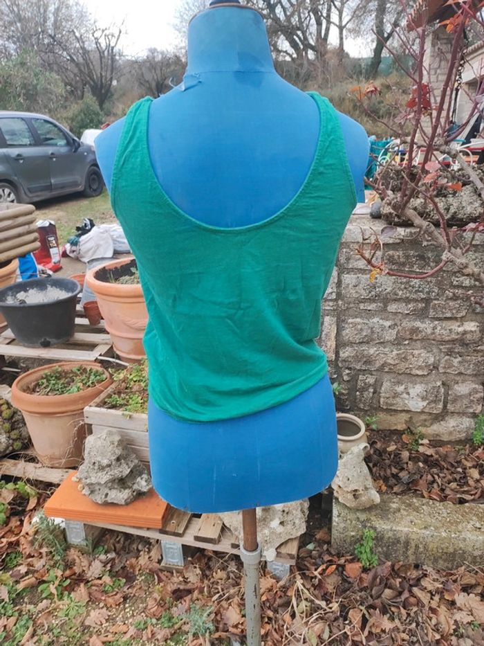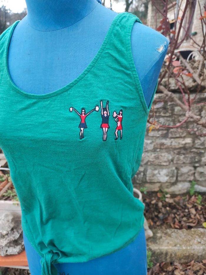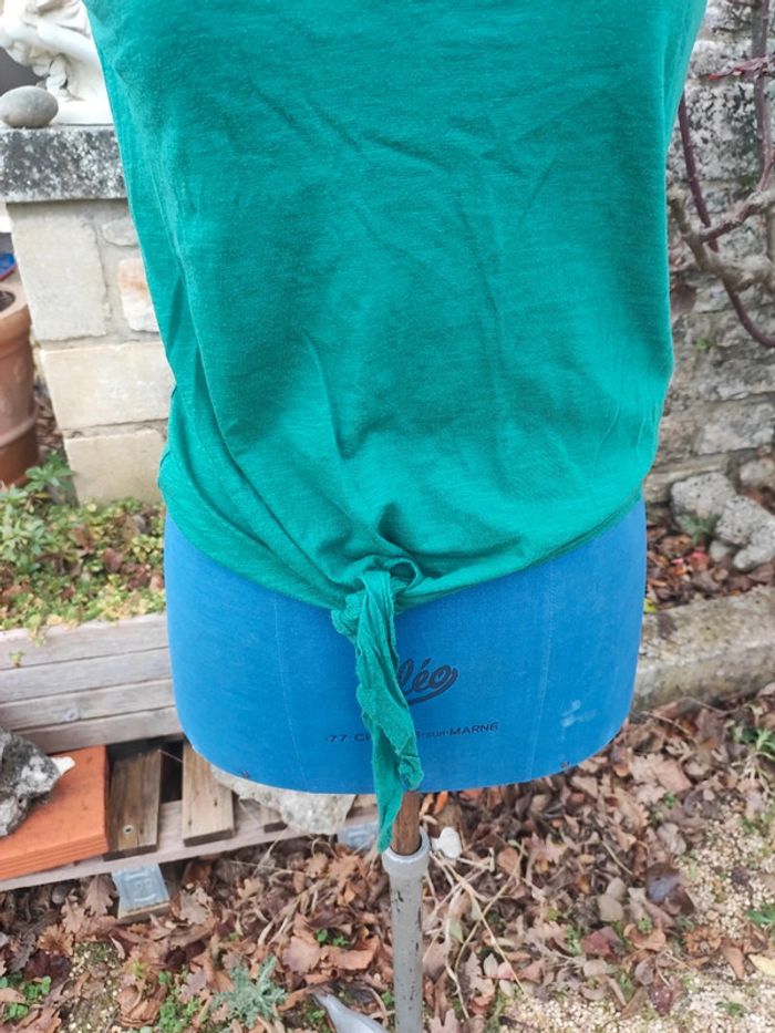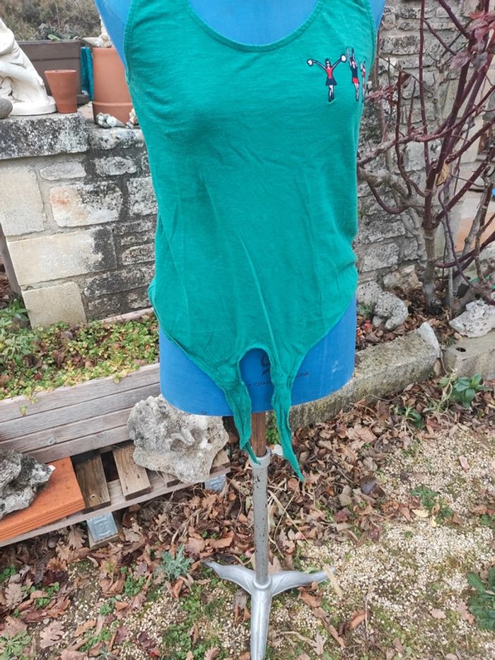 Débardeur vert avec motif, 3 pompon girl, avec noeud. Kiabi, taille S