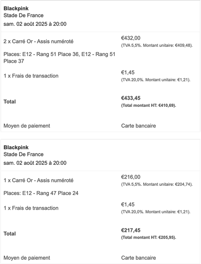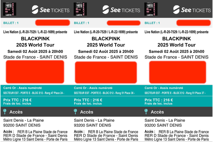 3 places à vendre pour le concert des BlackPink le samedi 2 août à 20h au Stade de France, Carré Or, au prix d'achat