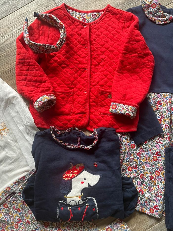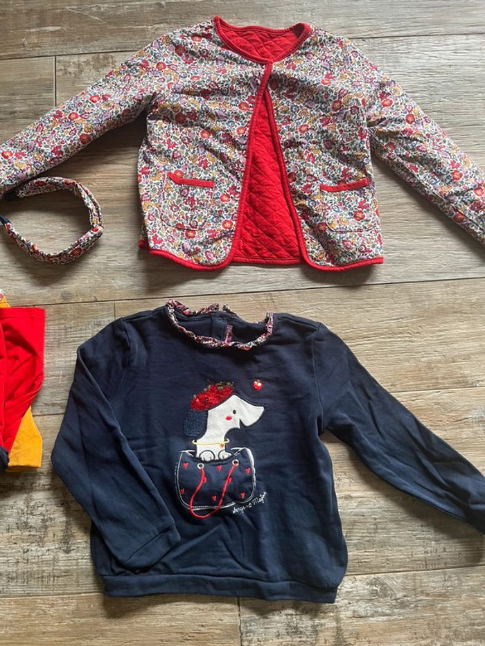 Lot comprenant, une robe 9 ans ( taille petite) , une veste réversible 7 ans, deux tee-shirts 7 ans, un sweat 7 ans, un short velours côtelé 6 ans, un legging 6/7 ans ( couleurs légèrement passées), un collant 23/31 et un serre tête.