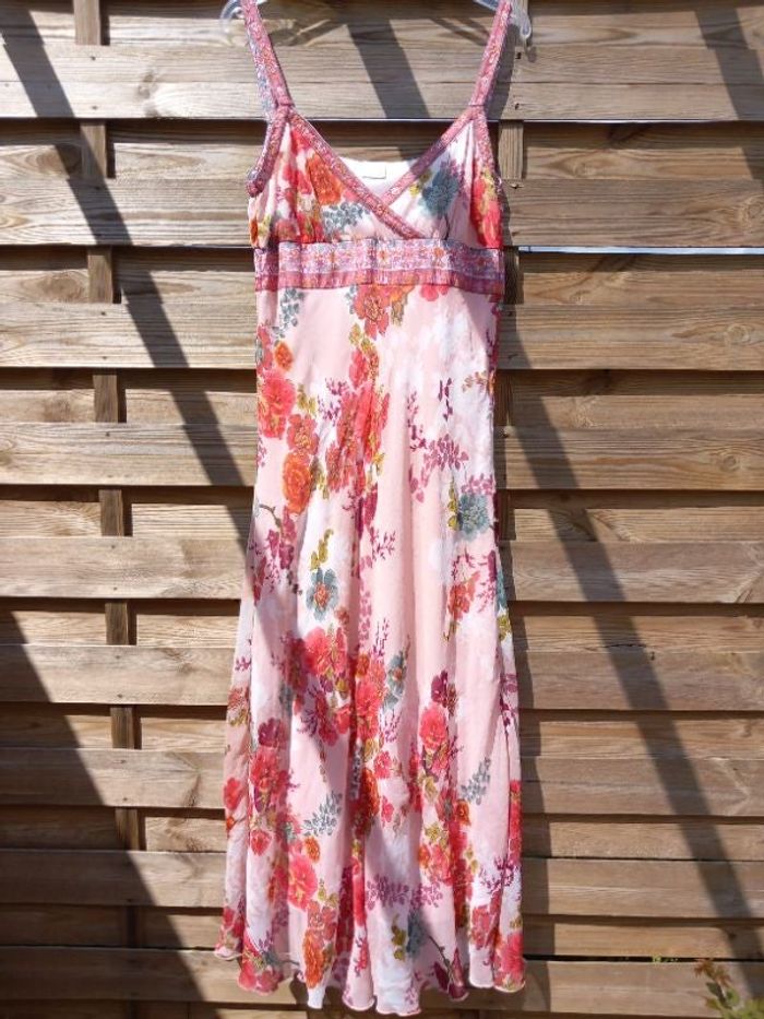 Robe en voile entièrement doublée. Imprimé fleuri sur fond rose poudré Détail perles et sequins Fermeture éclair sur côté Largeur aisselle à aisselle 46 cm Longueur 140 cm Polyester Taille 42 Quelques petites imperfections sur le voile et perles/ ne se voient pas la robe portée
